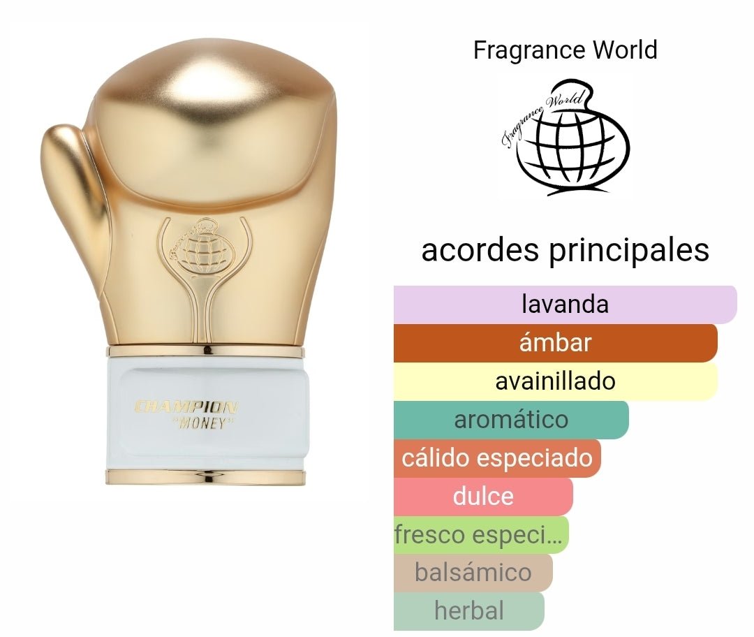 Champion Money de Fragrance World es una fragancia masculina de carácter elegante y envolvente, pensada para el hombre moderno que combina seguridad, estilo y sofisticación. Lanzado en 2025, este Eau de Parfum de 80 ml pertenece a la familia Oriental Amaderada , con una mezcla exquisita de notas frescas, aromáticas y dulces.