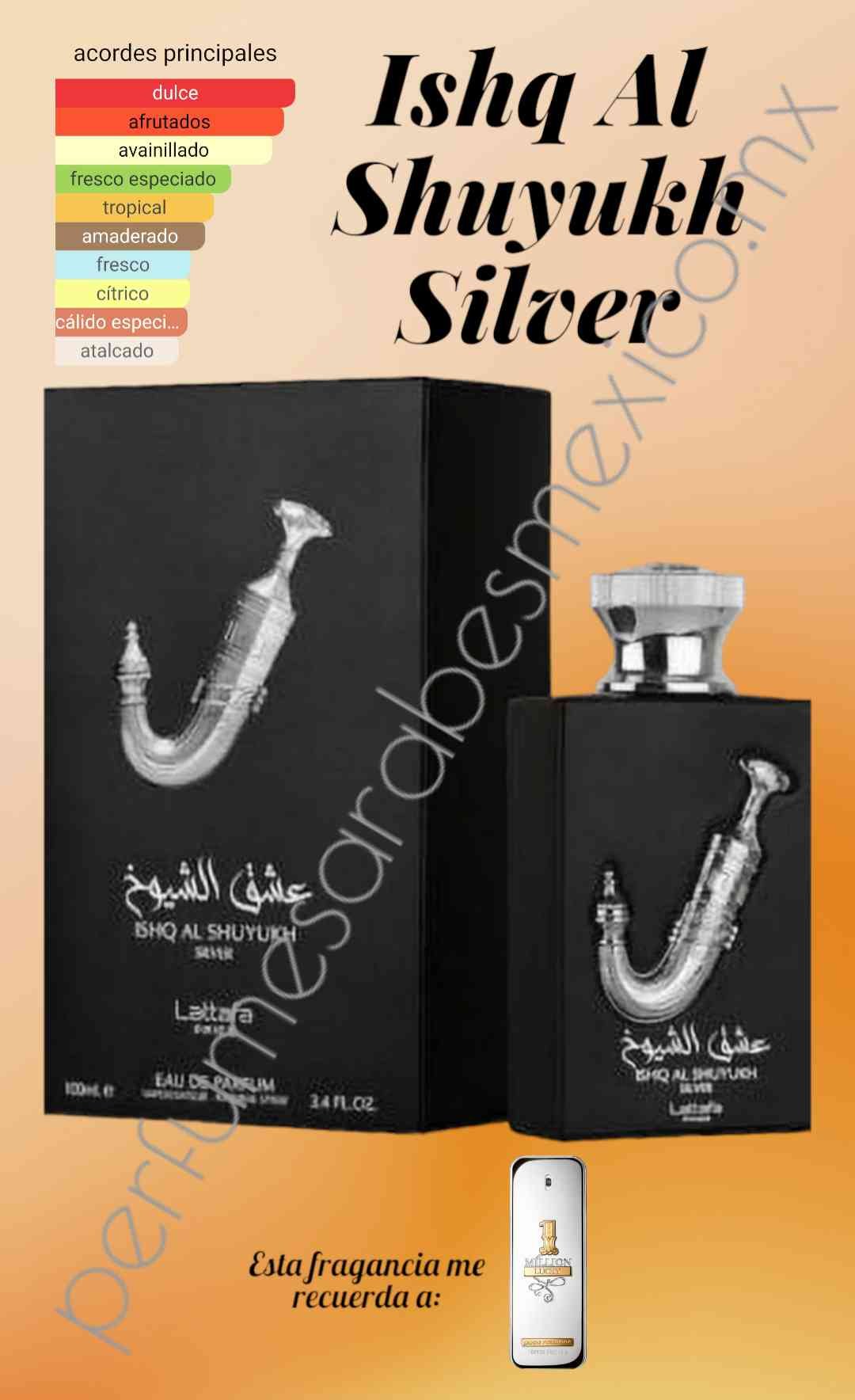 Lattafa Ishq Al Shuyukh Silver es una fragancia cautivadora que se abre con una vivaz explosión de limón y bergamota, creando una introducción fresca y vigorizante. Las notas cí­tricas picantes contrastan elegantemente con un toque jugoso de piña, que agrega un brillo afrutado a la mezcla. A medida que se desarrolla la fragancia, un toque de pimienta negra introduce un sutil toque picante, que proporciona un toque sofisticado. El corazón de la fragancia está anclado por los matices cálidos y reconfortantes de la vainilla, que se combina a la perfección con la riqueza amaderada del cedro y los matices terrosos del pachulí­. La composición se completa con madera de ámbar, que agrega una calidez resinosa moderna que realza la profundidad y la complejidad de la fragancia. Juntos, estos elementos crean un aroma dinámico y atractivo que captura tanto la frescura como la sensualidad, lo que hace de Lattafa Ishq Al Shuyukh Silver un clásico moderno.